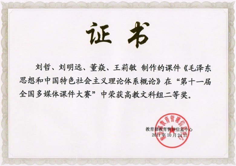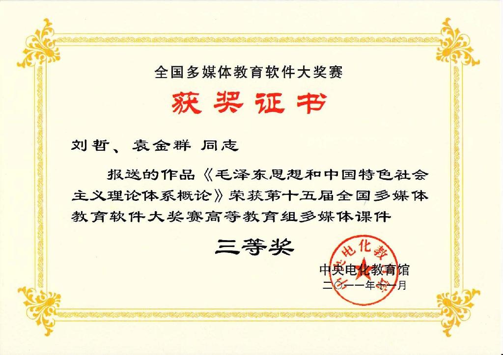 11月15日,由教育部指导,中央电化教育馆主办的“第十五届全国多媒体教育软件大奖赛”在京落下帷幕,思政部教师刘哲、袁金群制作报送的《毛泽东思想和中国特色社会主义理论体系概论》课件获高教组多媒体课件三等奖。 此前,由思政部教师刘哲、刘明远、董焱、王莉敏等老师制作的《毛泽东思想和中国特色社会主义理论体系概论》多媒体课件,代表beat365官网参加了“第十一届全国多媒体课件大赛”,通过陕西赛区初审、复赛和2011年10月22-23日在北京举行的现场决赛,荣获高教组二等奖。