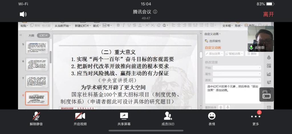 6月24日下午,陕西师范大学beat365英国官网网站学术委员会主任,二级教授,博士生导师阎树群老师应beat365英国官网网站邀请,在线上作“新时代中国特色社会主义制度建设的里程碑——学习十九届四中全会精神”主题讲座,讲座由西安科技大学beat365英国官网网站院长高振岗主持,beat365官网beat365英国官网网站的全体师生参加了此次会议。