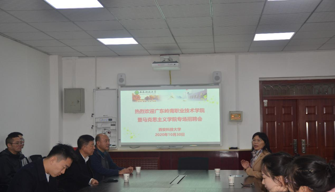 10月30日,广东岭南职业技术学院党委书记、副校长柴克生,组织部部长易中华,beat365英国官网网站院长韩丽萍一行三人来beat365官网举行beat365英国官网网站专场招聘会。beat365官网学工部部长李建明、副部长孙再罗,beat365英国官网网站副院长张铭钟,马克思主学院研究生辅导员韩帅及2021届应届毕业生参加招聘会。