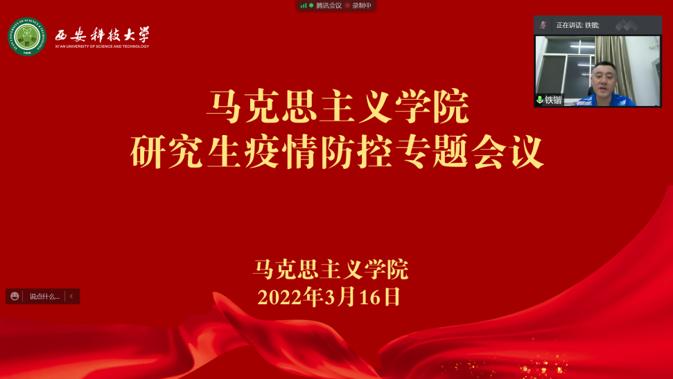 为进一步做好校园新冠肺炎疫情防控,加强雁塔校区研究生疫情防控的思想认识和行动自觉,积极推进研究生教育教学工作,3月16日,beat365英国官网网站以腾讯会议为平台,在线举行了研究生疫情防控期间线上主题班会,马克思主义学院副院长铁锴、研究生辅导员及雁塔校区研究生参加了主题班会。