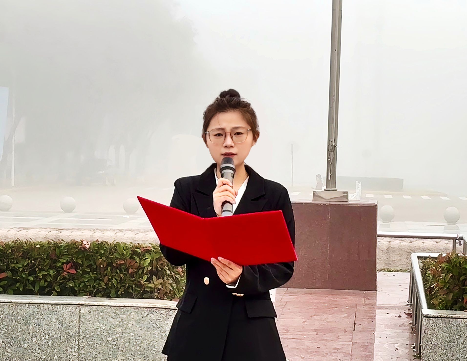 晨雾轻笼天地,五星红旗伴着国歌缓缓上升,红绸与雾中晨光温柔交织,猎猎声里既有岁月的厚重,更藏着冲破迷雾的坚定。全体师生昂首肃立,目光穿透薄雾随国旗攀升,仿佛与历史长河中那些坚守信仰、冲破迷雾的身影隔空相望。升旗仪式落幕后,张丹丹讲师以“光影”为引串联起跨越时空的精神对话。