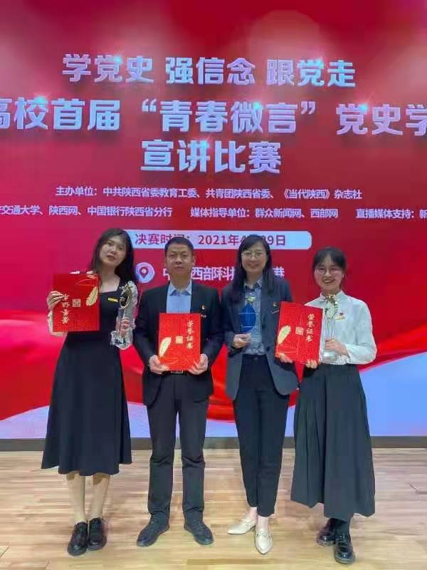 4月29日上午,陕西省高校首届“青春微言”党史学习教育宣讲比赛于中国西部科技创新港圆满落幕。学院2019级硕士研究生权颖庆荣获二等奖、最佳人气奖,张杰荣获三等奖,中国近现代史纲要教研室主任马建华荣获最佳指导老师奖。