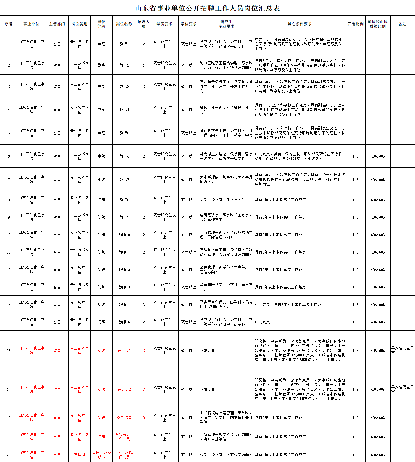面试时间、地点在山东石油化工学院网站人力资源处页面面向社会公布。请及时关注查看通知,并保持通讯畅通。