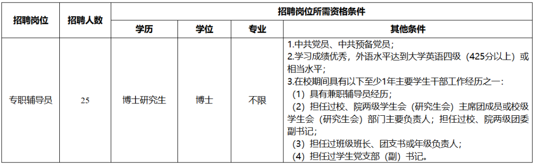 4.具有招聘岗位所需的学历、专业和其他条件。其中,学历为国家教育行政主管部门认可的博士研究生文化程度;专业以国家教育行政主管部门公布的研究生专业目录为准。留学归国等应聘人员所学学科专业与资格条件要求的学科专业相近但不在选定参考目录的,由学校结合所学课程、研究方向等进行审查。毕业证、学位证以及招聘岗位所要求的证书须于2025年12月31日前取得,工作经历计算截止时间为2025年4月15日;