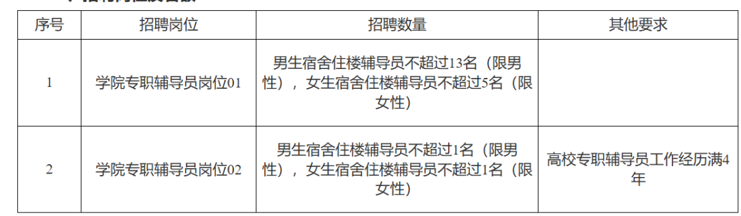 6.年龄要求:硕士研究生须为1996年7月1日及以后出生,博士研究生须为1992年7月1日及以后出生,博士后须为1989年7月1日及以后出生。有两年及以上高校专职辅导员工作经历者年龄可放宽2周岁。