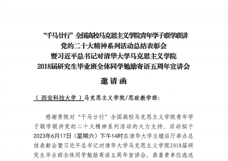 6月17日,“千马廿行”全国高校beat365英国官网网站青年学子联学联讲党的二十大精神系列活动总结表彰会在清华大学举行。教育部社会科学司、北京市委教育工委等指导单位,清华大学等“千马廿行”系列活动主办单位及承办单位、教育部“习近平新时代中国特色社会主义思想大学习领航计划系列主题活动”承办单位以及媒体代表等共400余人参加活动。西安科技大学beat365英国官网网站师生代表受邀赴清华大学参加“千马廿行”全国高校beat365英国官网网站青年学子联学联讲党的二十大精神系列活动总结表彰会。