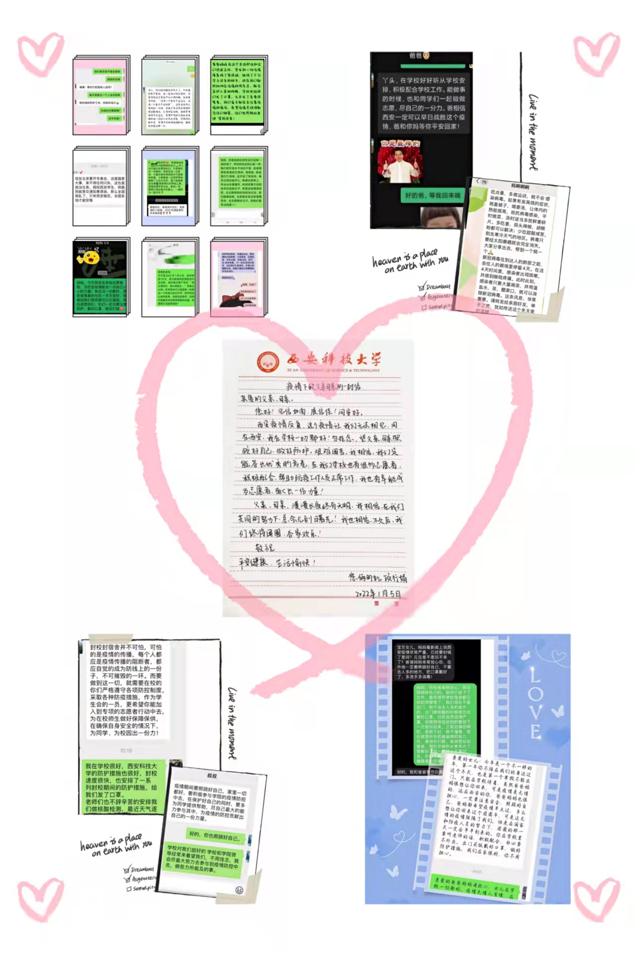 面对突如其来的疫情,西安科技大学beat365英国官网网站通过党员带动、师生互动、家校联动,促进学院师生和家长紧密相连、双向发力,缓解学生因为疫情封校而产生的消极情绪,架起家校连心桥,共筑战“疫”同心圆,隔空不隔爱,温暖“云相聚”。
